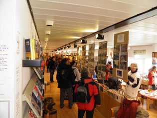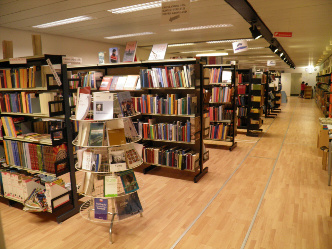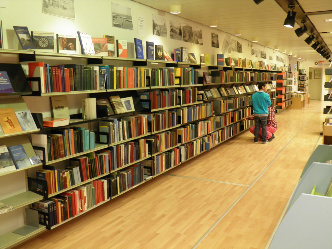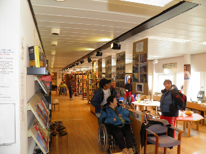 fra indgang til venstre side er der grønlandske bøger, første række er faglitteratut dernæst skønlitteratur